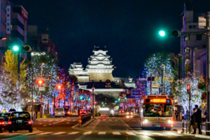 A dazzling illumination of lights and colors decorates the large area stretching from Himeji Station to Himeji Castle.